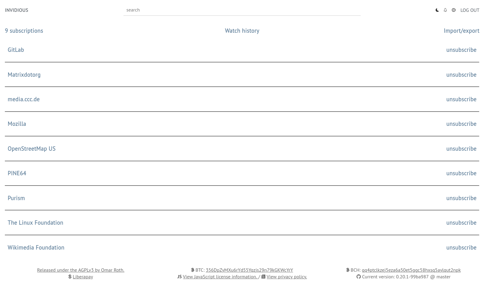 • Import subscriptions from YouTube, NewPipe and Freetube